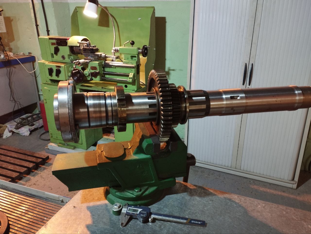 На фото пример использования тисков ТСЧ-200 для сборки шпинделя станка 1К62 длиной 940 мм и весом около 40 кг.